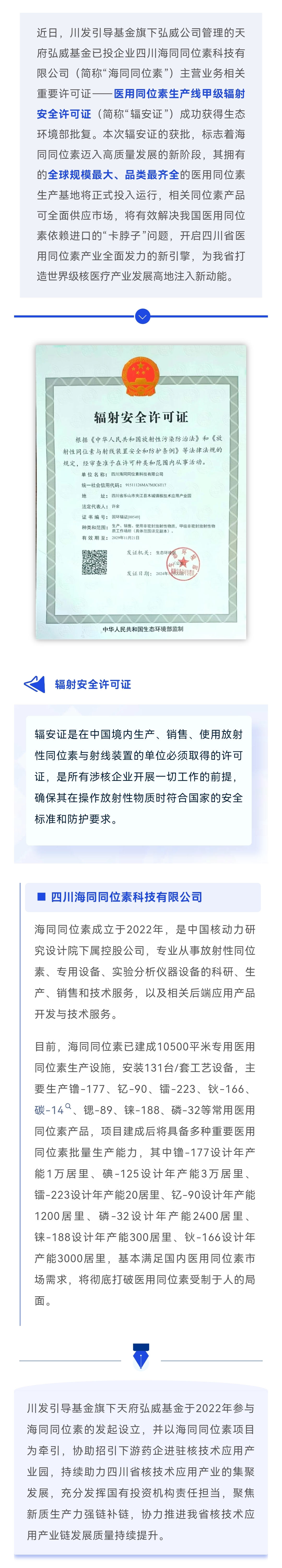 已投企業動態 | 海同同位素成功獲批輻安證,助力四川省醫用同位素行業再上新臺階